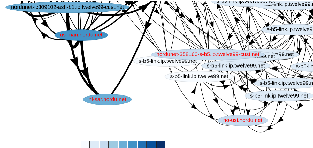 Traceroute visualization shows red nodes where the route has stopped. We see several nordunet routers in the list